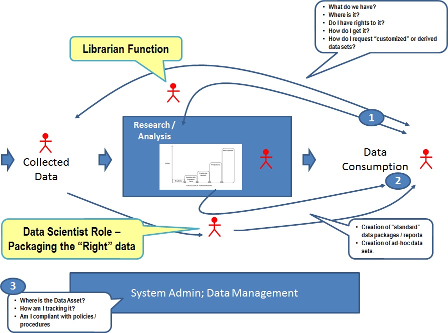 Additionally viewing the problem this way will address how the organization is thinking about the process. How is the library function addressed? Is there a cataloging function that keeps an inventory of all data assets available to the organization? Is there a role of data scientist – perhaps data “packager” is a better term for most organizations. Is there an organizational element to why metadata is getting fragmented? An example of this would be that the Librarian function is organizationally part of the Research Division. Data collection and packaging is an IT function. The Library software that manages the search and cataloging functions is managed separately from the metadata management system supporting the data warehouse. Anything done by Research creates fragmentation, and possibly duplication of metadata.